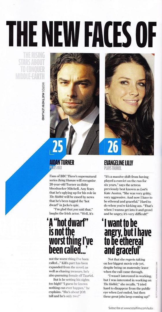 En el reportaje se apunta a que el papel de Kili ha sido ampliado en las películas; y que al igual que persigue un tesoro, también está interesado en la Elfa Tauriel, aunque quizás su personaje ponga las expectativas demasiado altas. “¡Ella es como de unos 20 pies de altura y él solo de dos!”.