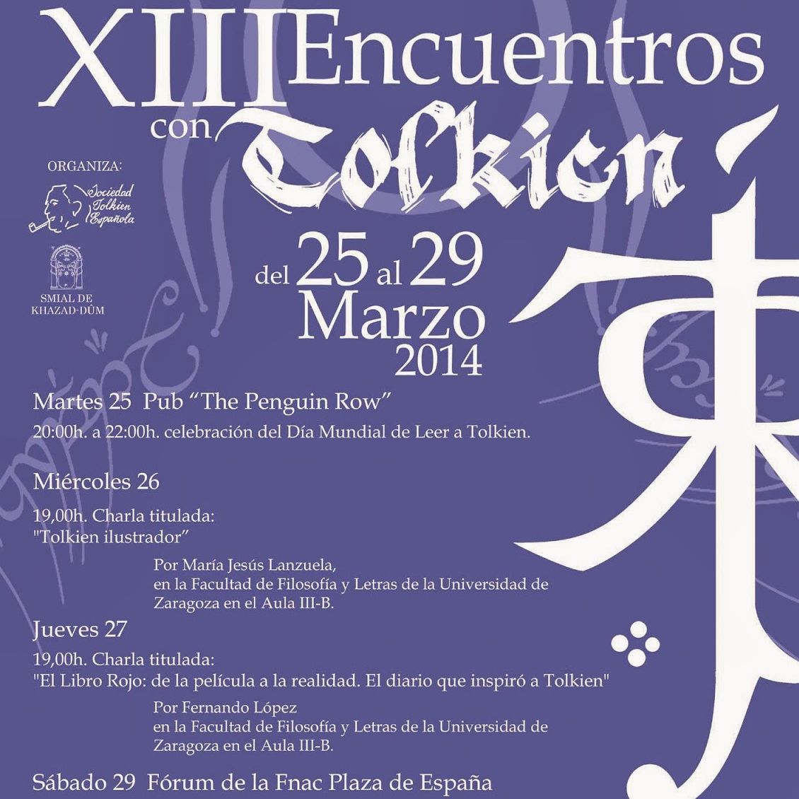 Nuestros buenos amigos de la Sociedad Tolkien Española informaron en su cuenta de Twitter que el Smial de Khazad-Dûm, su delegación en Zaragoza, organizará sus decimoterceros Encuentros con Tolkien los próximos 25, 26, 27, 28 y 29 de Marzo. En esta ocasión todos los eventos y actividades están concentrados en una semana muy especial para todos los Tolkiendili, la semana del 25 de Marzo, el Día Mundial de Leer a Tolkien.