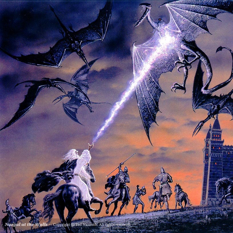 (Gandalf ahuyenta a los Nazgûl frente a Minas Tirith, por el artista canadiense Ted Nasmith)