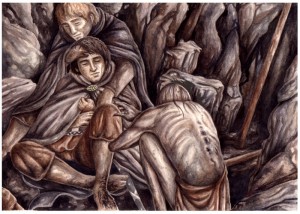(Frodo, Sam y Gollum en la entrada del Antro de Ella-Laraña, según Dimitri Bielak)