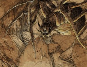 “—Éste es el camino —dijo Gollum en voz baja—. Por aquí se entra en el túnel. —No dijo el nombre: Torech Ungol, el Antro de Ella-Laraña. Un hedor repugnante salía del agujero, no el nauseabundo olor a podredumbre de los prados de Morgul, sino un tufo fétido y penetrante, como si allí, en la oscuridad, hubiesen acumulado montones de inmundicias.