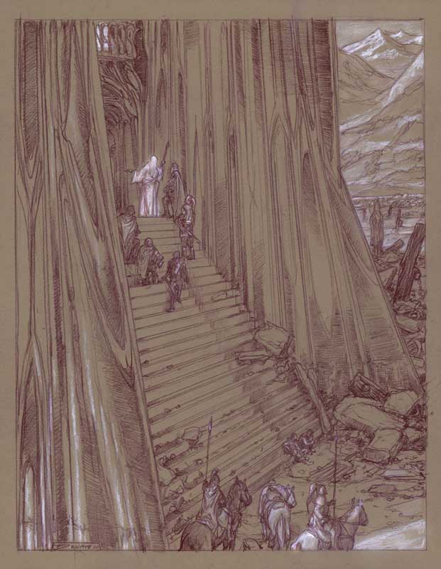 Al pie de la escalera Gandalf y el rey se apearon de las cabalgaduras.