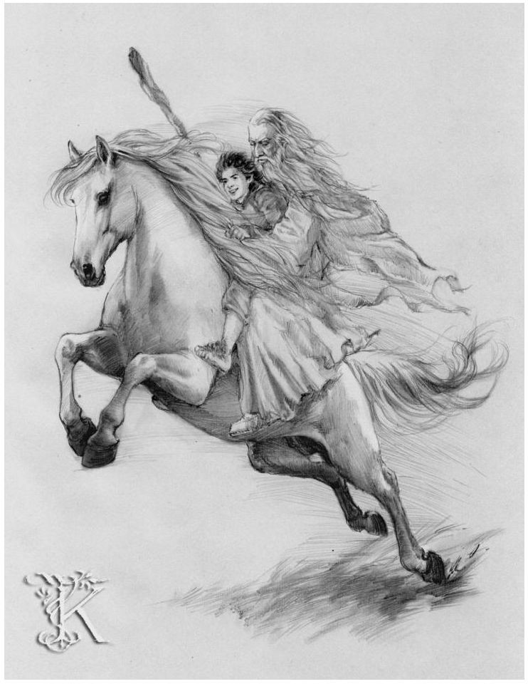 “—Esta vez cabalgarás conmigo —dijo—. Sombragrís te mostrará cuánto es capaz de hacer. —Volvió entonces al sitio en que había dormido. Sombragris ya lo esperaba allí. Colgándose del hombro el pequeño saco que era todo su equipaje, el mago saltó a la grupa de Sombragrís. Aragorn levantó a Pippin y lo depositó en brazos de Gandalf, envuelto en una manta.