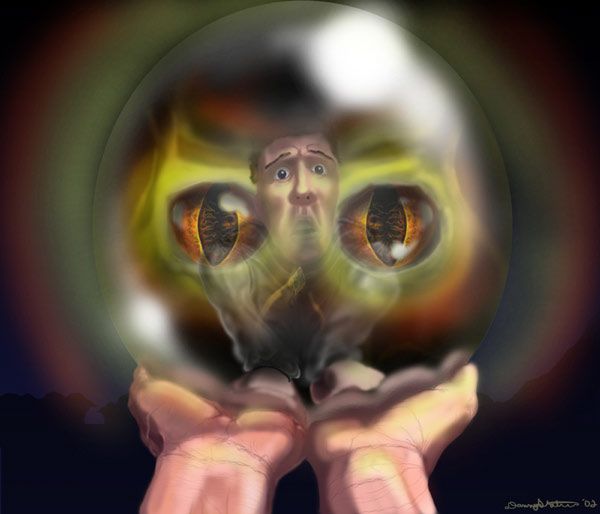 “Pippin se sentó con la esfera entre las rodillas levantadas y se inclinó sobre ella como un niño glotón sobre un plato de comida, en un rincón lejos de los demás. Abrió la capa y miró. Alrededor el aire parecía tenso, quieto. Al principio la esfera estaba oscura, negra como el azabache, y la luz de la luna centelleaba en la superficie lustrosa. De súbito una llama tenue se encendió y se agitó en el corazón de la esfera, atrayendo la mirada de Pippin, de tal modo que no le era posible desviarla. Pronto todo el interior del globo pareció incandescente; ahora la esfera daba vueltas, o eran quizá las luces de dentro que giraban. De repente, las luces se apagaron. Pippin tuvo un sobresalto y aterrorizado trató de liberarse, pero siguió encorvado, con la esfera apretada entre las manos, inclinándose cada vez más. Y súbitamente el cuerpo se le puso rígido; los labios le temblaron un momento. Luego, con un grito desgarrador, cayó de espaldas y allí quedó tendido, inmóvil.”