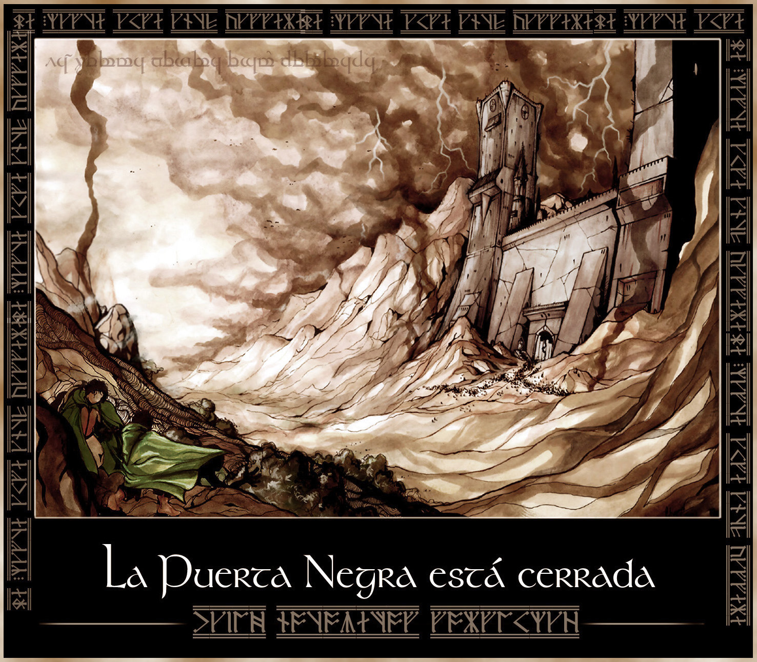 A la entrada del desfiladero, de pared a pared, el Señor Oscuro había construido un parapeto de piedra. En él había una única puerta de hierro, y en el camino de ronda los centinelas montaban guardia. Al pie de las colinas, de extremo a extremo, habían cavado en la roca centenares de cavernas y agujeros; allí aguardaba emboscado un ejército de orcos, listo para lanzarse afuera a una señal como hormigas negras que parten a la guerra. Nadie podía pasar por los Dientes de Mordor sin sentir la mordedura, a menos que fuese un invitado de Sauron, o conociera el santo y sería que abría el Morannon, la puerta negra de su tierra.”