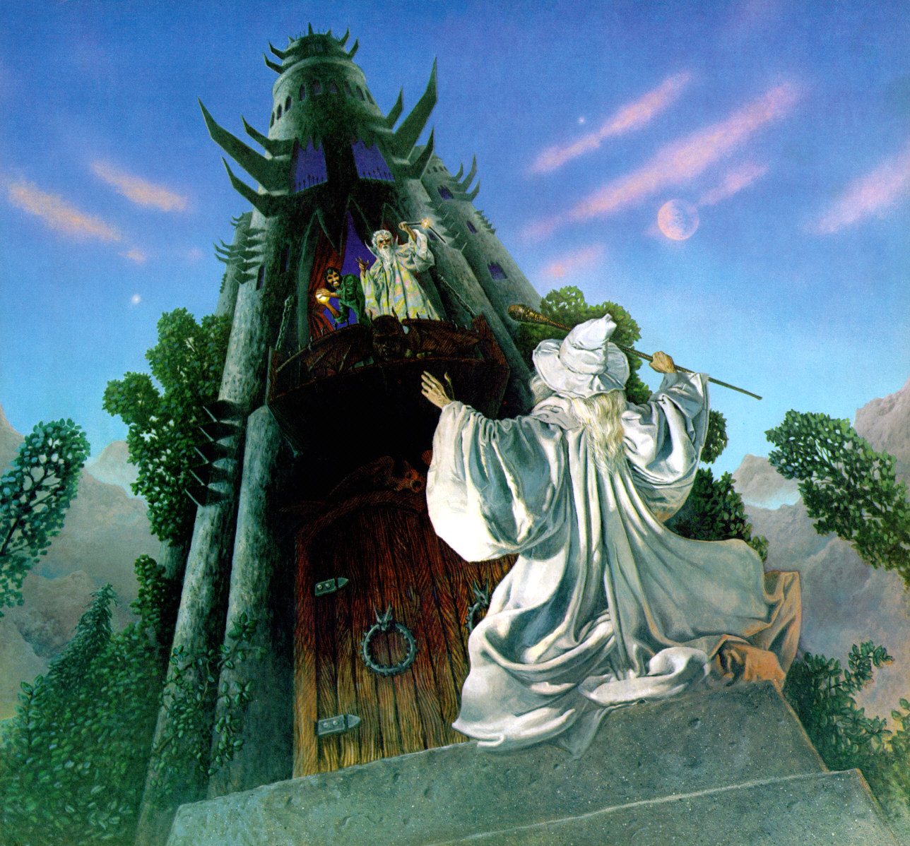 “Gandalf se detuvo ante la puerta de Orthanc y golpeó en ella con su vara. Retumbó con un sonido cavernoso.