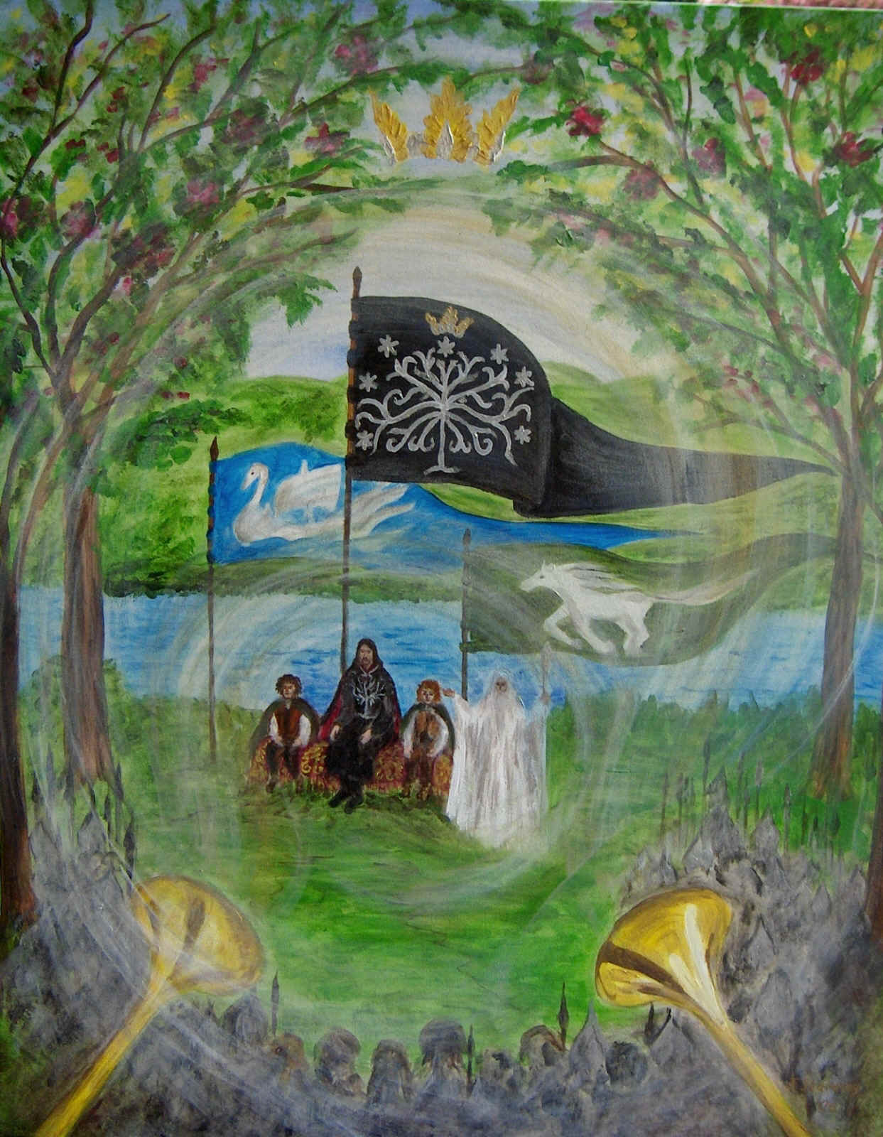 “Y llegaron a un amplio campo verde, y más allá corría un río ancho en cuyo centro asomaba un islote boscoso con numerosas naves ancladas en las costas. Pero en ese campo se había congregado un gran ejército, en filas y compañías que resplandecían al sol. Y al ver llegar a los Hobbits desenvainaron las espadas y agitaron las lanzas; y resonaron las trompetas y los cuernos, y muchas voces gritaron en muchas lenguas: