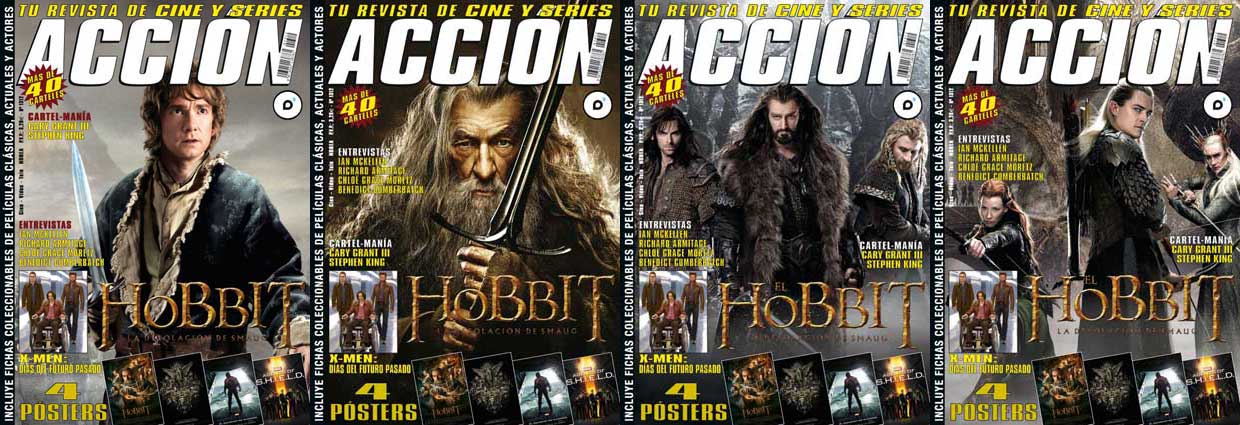 ¡Ya era hora de ver reportajes sobre La Desolación de Smaug en las revistas españolas! En su número de Diciembre, la revista Acción Cine publica un reportaje de 10 páginas sobre la segunda película de la trilogía de El Hobbit que incluye entrevistas con Ian McKellen, Richard Armitage y Benedict Cumberbatch. Además, este número sale a la venta con 4 portadas diferentes dedicadas a La Desolación de Smaug.