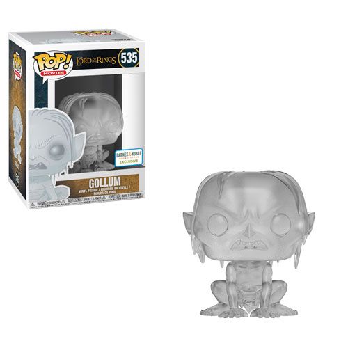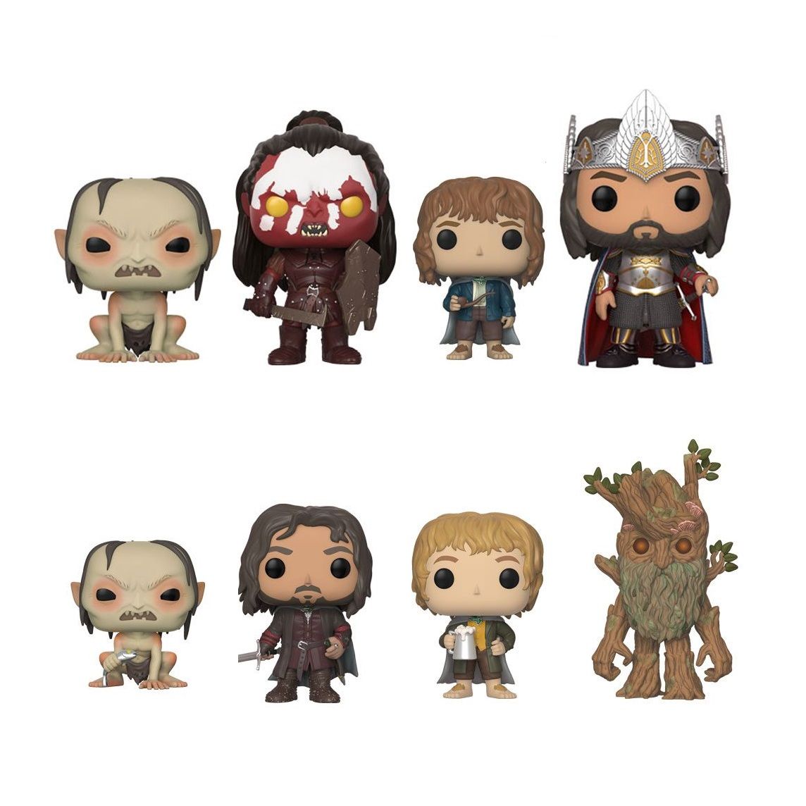 Los nuevos muñecos Pop! de vinilo de Funko son: uno de Gollum, uno de Gollum con pescado (su rareza será de 1 de cada 6), uno de Aragorn, uno de Lurtz, uno de Merry, uno de Pippin, uno de Bárbol (¡de 15 centímetros de alto!), uno de Gollum invisible (exclusiva de Barnes and Noble) y uno del Rey Elessar (exclusiva de Toys”R”Us).