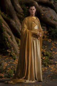 Gil-Galad trata de mantener a raya a la oscuridad utilizando sus múltiples habilidades según sea necesario. Es un político, pero también un guerrero. Así es como el público ve a Gil-Galad. en el prólogo de ‘La Comunidad del Anillo‘. En ‘Los Anillos de Poder’, los sutiles toques en la apariencia de Gil-Galad apuntan a esas habilidades. Los anillos de piedra y gemas que lleva forman un conjunto ornamentado de lo que son casi nudillos de latón cuando cierra el puño. El pelo de Gil-Galad. es largo, como tradicionalmente vemos en los elfos nobles, pero está afeitado a los lados como si fuera un guerrero. ‘Lo conocemos como un guerrero. Vamos a verlo como un guerrero. Pero es un político en el sentido que nos gustaría tener, en el sentido de que intenta sacar lo mejor de todos nosotros, para que cuando necesitemos unirnos, podamos hacerlo’, dice Walker.